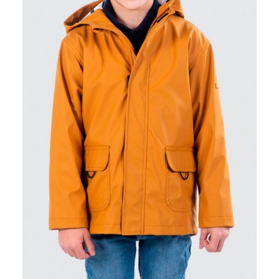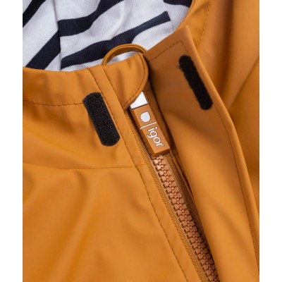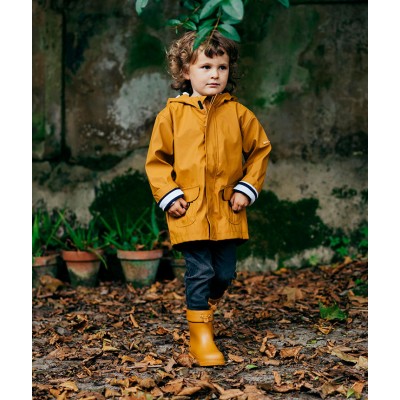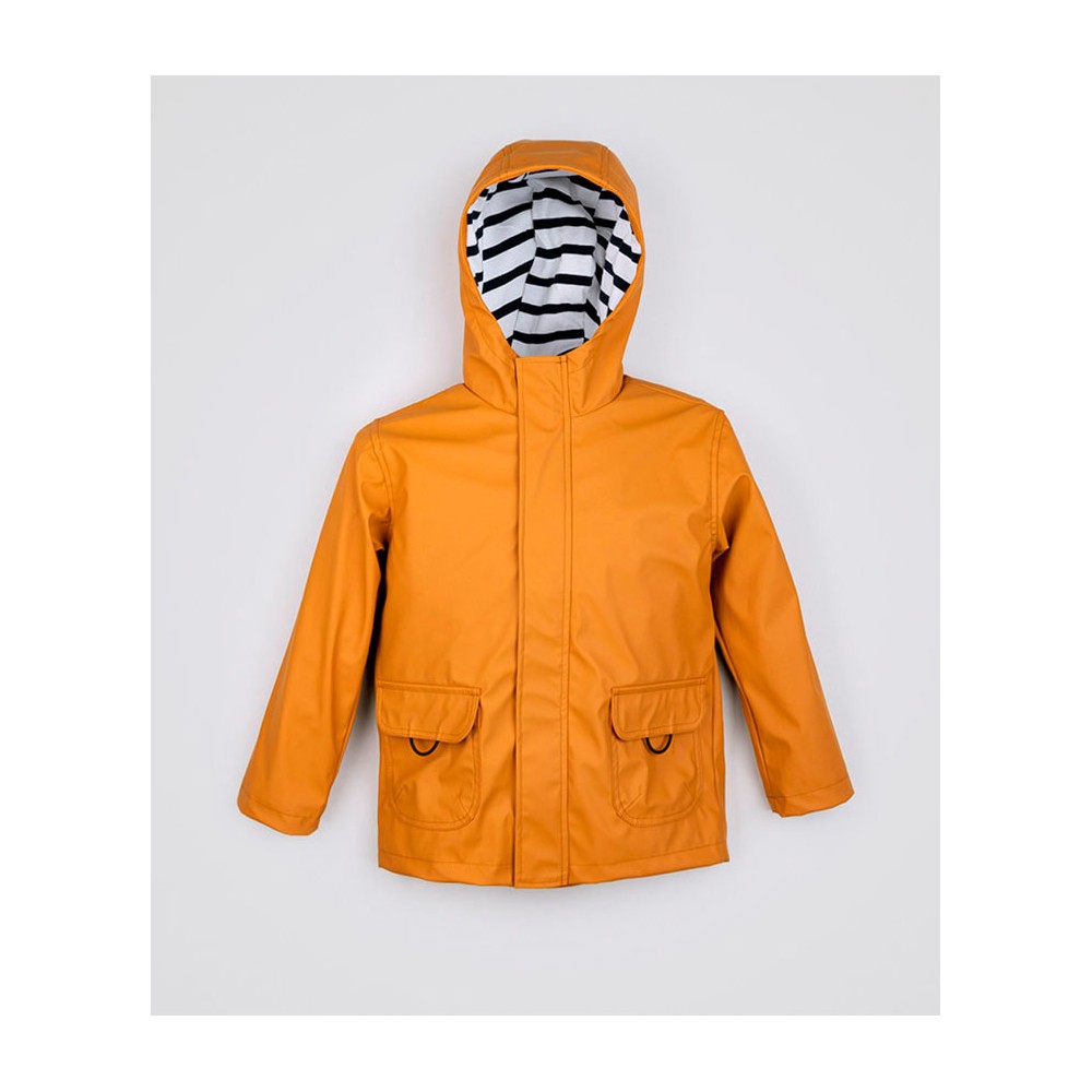 Chubasquero clásico impermeable con bolsillos frontales, solapa y forro interior de algodón a rayas.