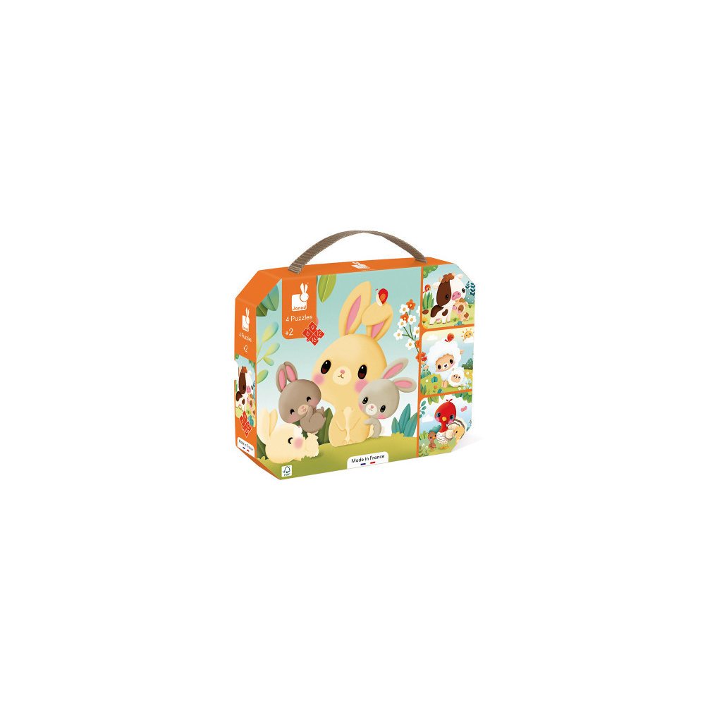 Y, para que pueda disfrutar de sus puzzles de la granja de forma independiente, el pequeño puede utilizar el color de la parte trasera de cada puzzle para identificarlos mejor. Y, por último, ¿quiénes mejor que los animalitos de la granja para estimular al bebé? Las tiernas y entrañables ilustraciones ayudan al niño a aprenderse los nombres de los animales y sus crías: un conejo y sus conejitos, una oveja con su cordero, una vaca y su ternero, un pavo y sus pavipollos… ¡Sí! Los 4 puzles se guardan en el ingenioso maletín con las imágenes de nuestros simpáticos amiguitos. Los puzzles son ideales para enseñar a los niños a ejercitar la lógica, la concentración y la calma. ¡Añade unas preciosas ilustraciones y tendrás un primer puzle infantil muy beneficioso para ayudarles a crecer bien! Este juego de puzles se fabrica en Francia y está hecho de cartón con certificado FSC™. Está decorado con tintas vegetales.