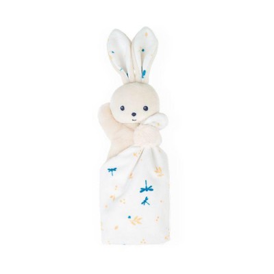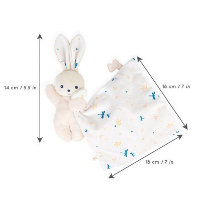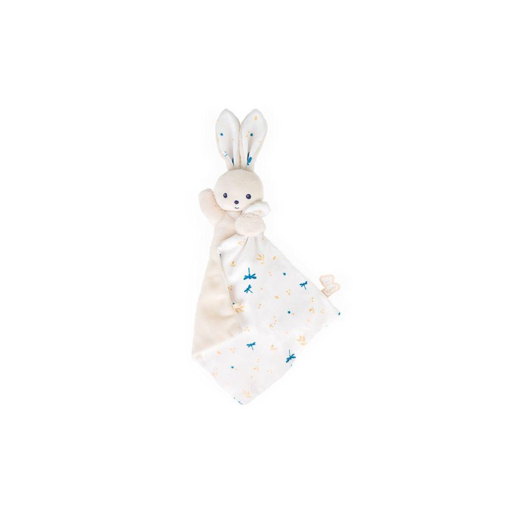 Este conejo envuelto en un cuadrado de suavidad de 18 cm será el mejor amigo del bebé. Se ha puesto especial cuidado en la selección de materiales, con un 95% de materiales y tapicerías reciclados. Con su adorable cuerpo y su suave pelaje, este conejo es fácil de agarrar y sujetar por el cuerpo o sus largas orejas. La mantita cuadrada que lleva en sus manos está cubierta de pequeñas libélulas que dan vueltas entre las ramitas doradas. El color de este delicado y poético estampado se encuentra en las orejas del conejo y lo realza todo. Se presenta en una bonita caja que se puede reutilizar como estuche de almacenamiento. Es el doudou perfecto para hacer un regalo de materiales reciclados. Lavable a máquina a 30 °C. Desde el nacimiento.