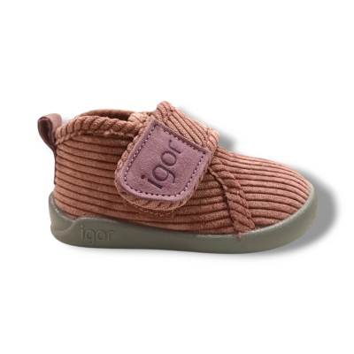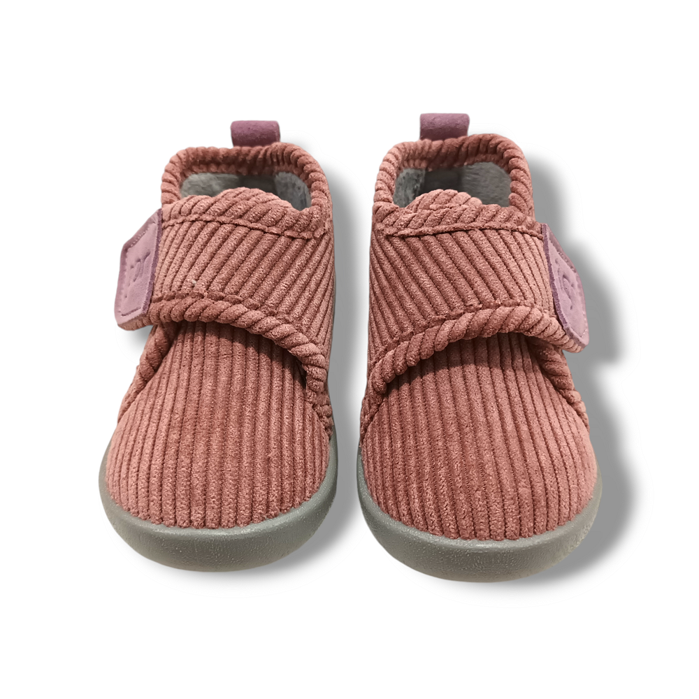 Zapatilla de estar por casa para niños y niñas, de concepto barefoot, cero drop, flexible, blandito, cierre adherente y fabricada en un tejido de pana súper suave.